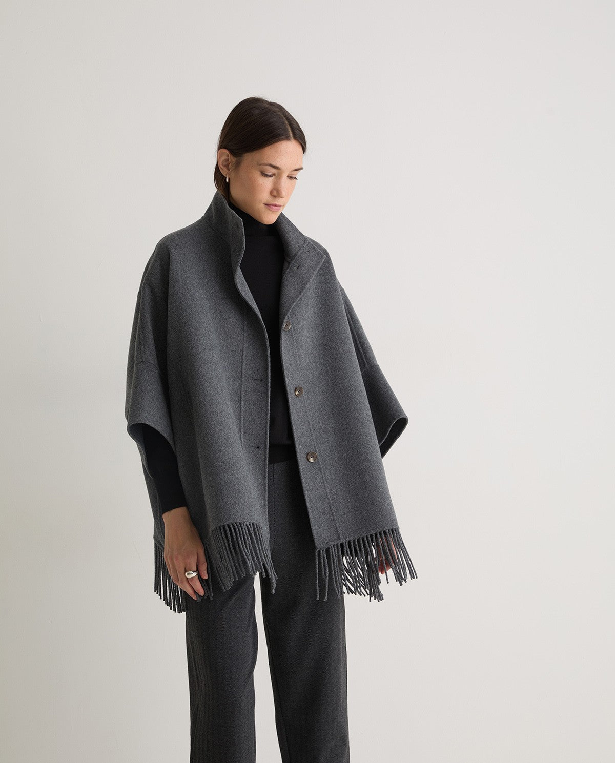 Capa artesanal de doble faz. Mezcla de lana y fibras recicladas. Cuello alto. Mangas tres cuartos. Cierre frontal con botones. Flecos en los extremos. Bolsillos laterales.