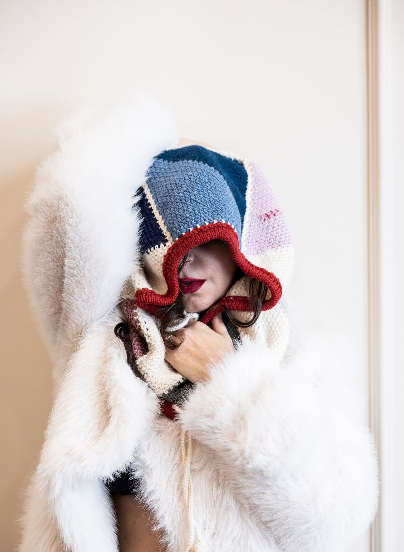 The balaclava is finished with hand-knitted framing around the face and neck, creating soft thresholds that define the body while remaining flexible. A handmade cord introduces movement and adjustability, allowing the piece to shift between protection and exposure.