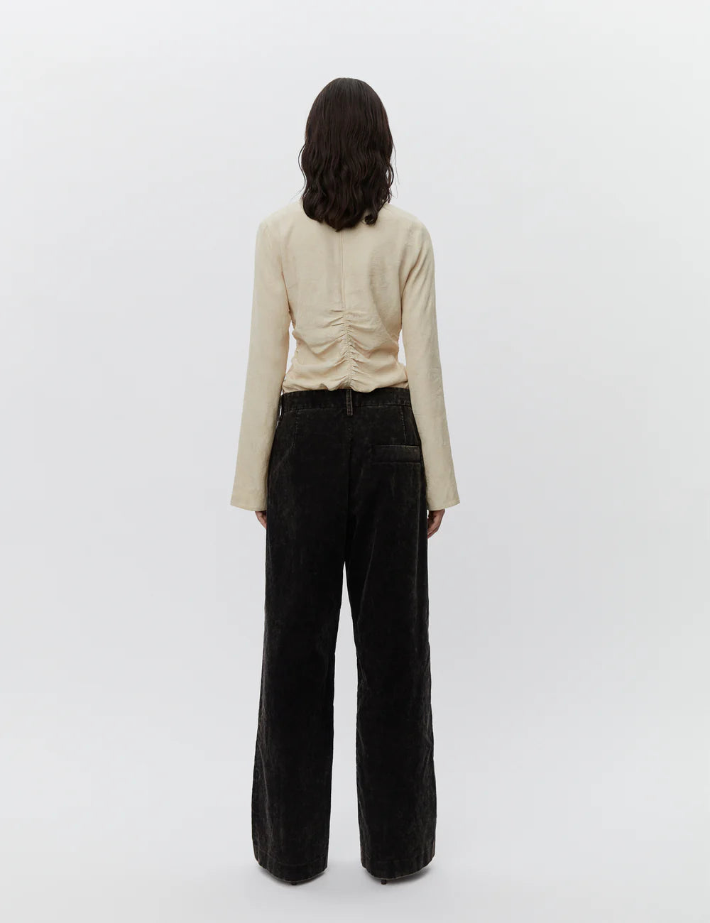 Este top presenta un escote en V alto, fruncido en el centro y los laterales, y cierre de cremallera en la espalda. Tiene un corte entallado.