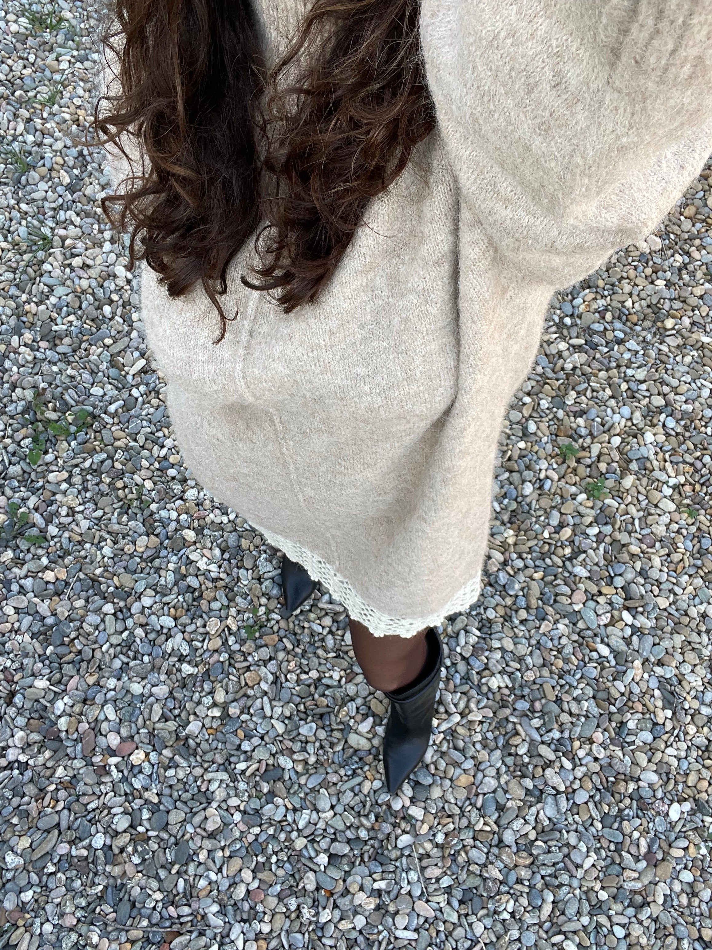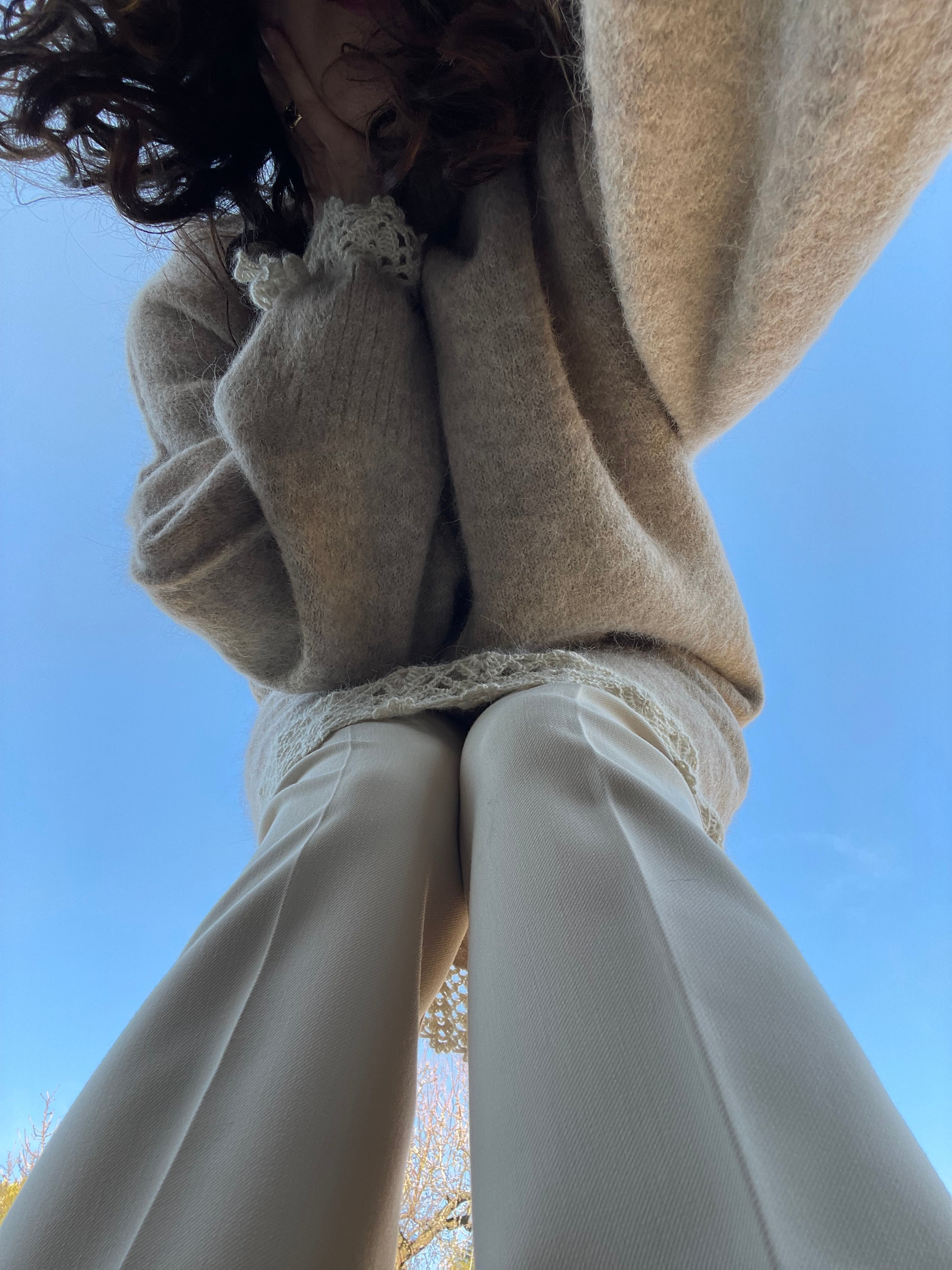 When I first touched its fluffy, warm texture, I immediately felt its potential — a garment perfect for cold weather, perhaps even the warmest piece in the boutique. But at first sight, it was too simple. A single line in the front, sleeves that felt long and undervalued. I imagined them emerging from under a coat yet not calling the attention they deserved. The bottom had the same feeling — I pictured it with knee-high boots, but something was missing, an accent, a spark. So I added these elements instinctively. No second guessing — the perfect pattern appeared immediately:
