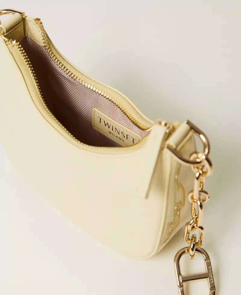 ‘Mini Croissant’ faux patent leather hobo bag with chain and metal Oval T karabiner. Zip closure, removable cross-body and shoulder strap, gold-toned hardware, lining.