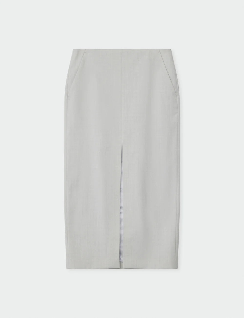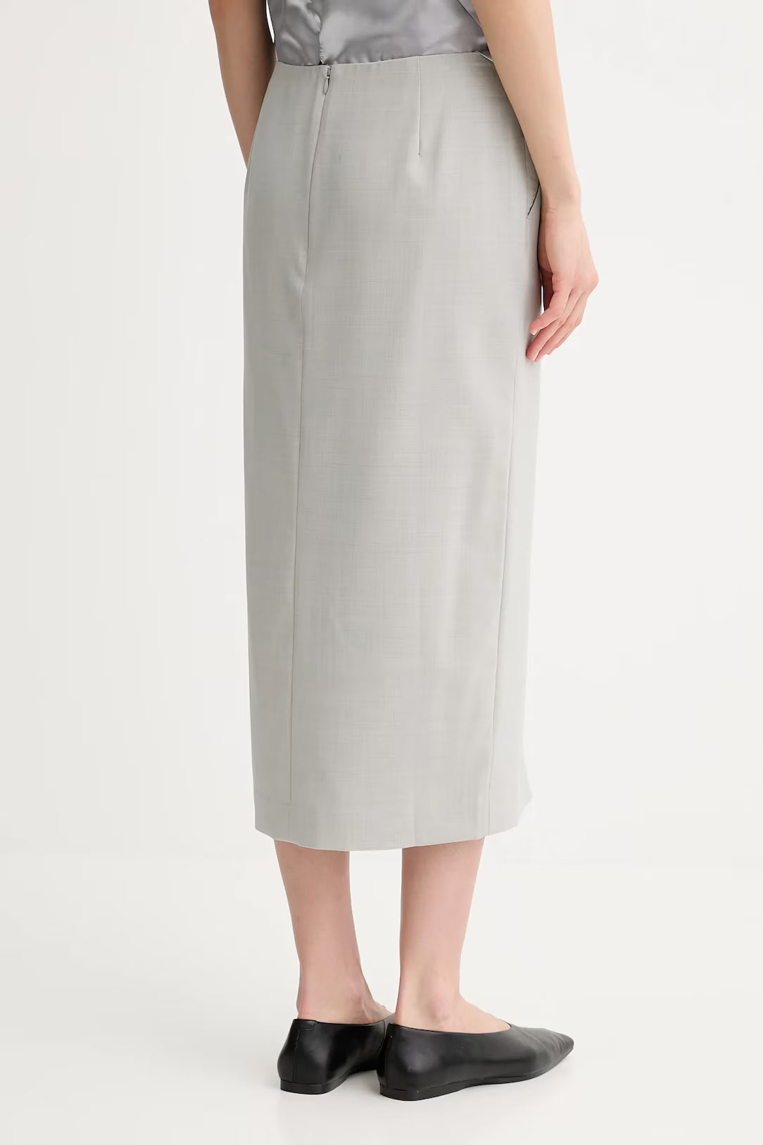 This midi-length pencil skirt features a zip closure in the back, side pockets, and a slit in the middle. The skirt is fully lined and has a slim fit.