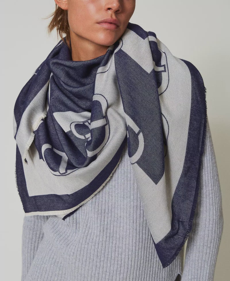 Two-tone viscose blend jacquard kefiah with macro Oval T pattern and slightly frayed hems.