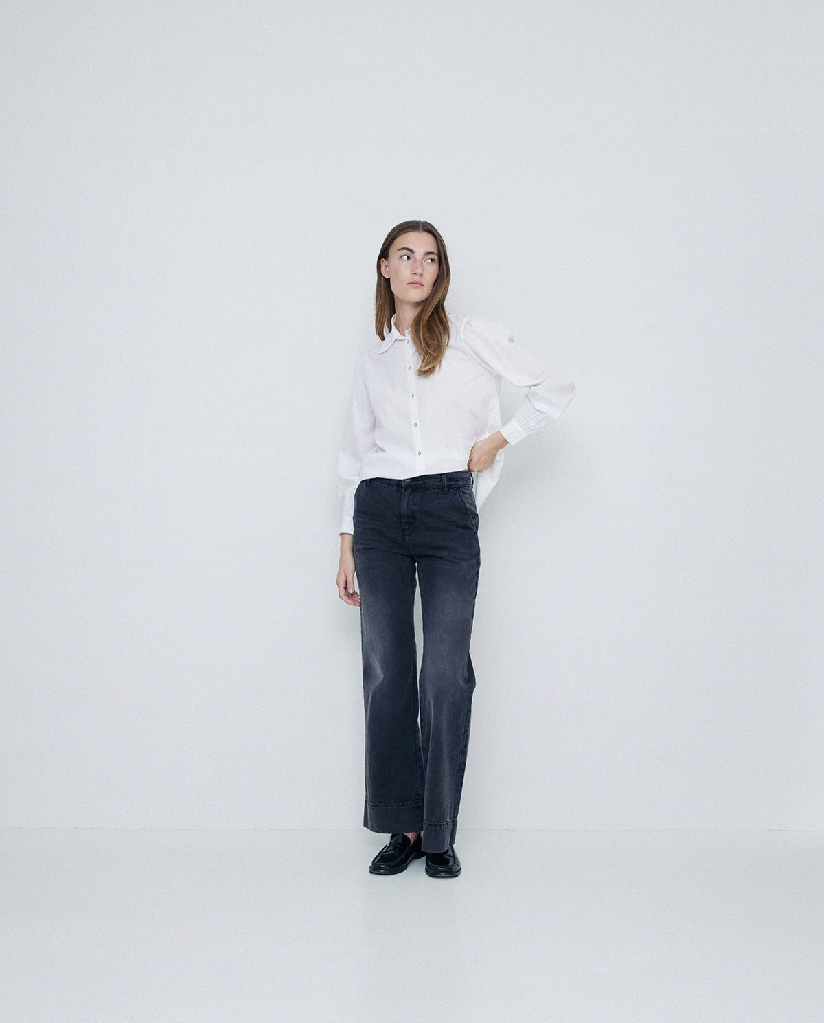 Jeans denim de pierna ancha. Fabricados en algodón orgánico. Bolsillos laterales. Cierre con cremallera y botón. Con trabillas.