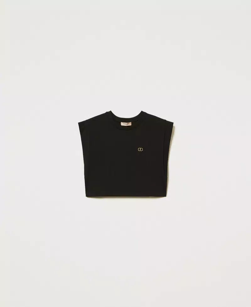 Cotton jersey cropped t-shirt with a rhinestone Oval T logo, a round neck, short sleeves with turn-up, and a loose fit.