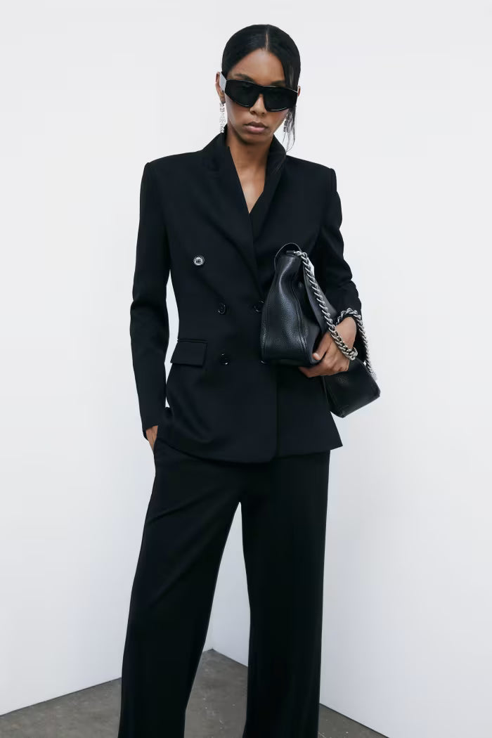This double-breasted blazer in durable stretch fabric features peak lapels, a relaxed fit, and sharp shoulders to define the silhouette. Metal Fly-logo rivets on the sleeves and refined front stitching complete the look. Versatile from office to after-work – wear it with the matching slim trousers for a sleek, modern set. Stretch stitched fabric, compact and durable Double breasted boyfriend fit Boyfriend shoulder Regular sleeves Zigzag stitched seams; Fly rivets on the cuffs 65% Viscose, 30% Nylon, 5% Elastane